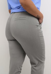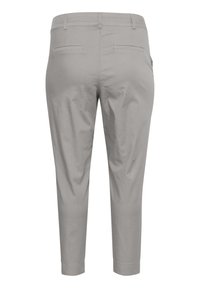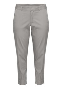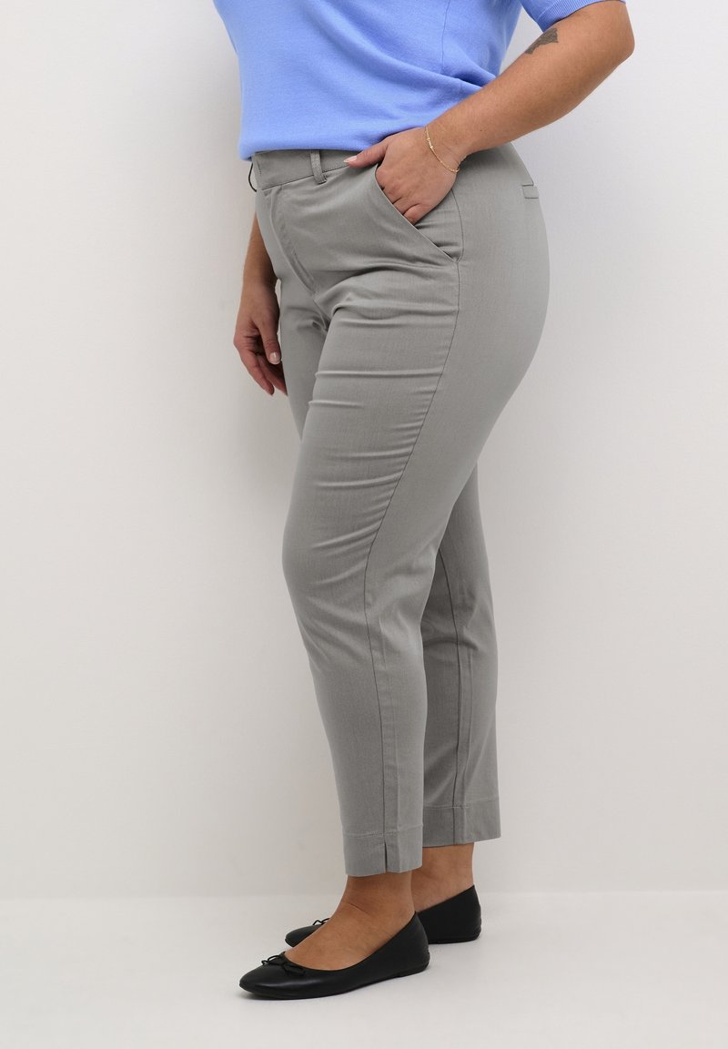 Pantalon gris clair à coupe ajustée, doté de poches latérales et d'une texture lisse. Associé à des ballerines noires et un haut bleu.