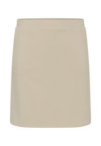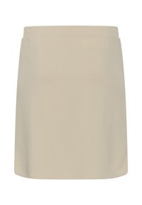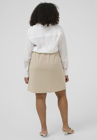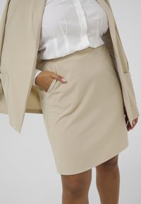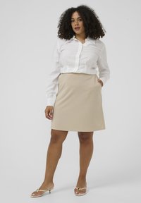 Femme portant une jupe beige mi-genoux, un chemisier blanc à manches longues, et des talons ouverts beiges ornés d'une décoration en forme de cœur doré.
