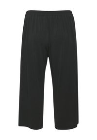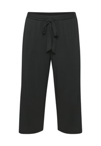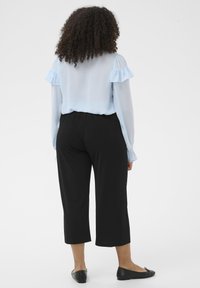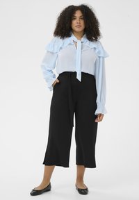 Pantalon noir large et court avec des fentes latérales et une ceinture nouée, porté avec des ballerines noires et un chemisier bleu clair à manches longues.