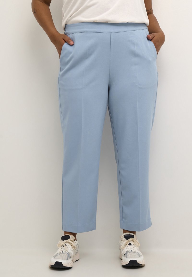 Pantalon bleu clair ajusté à texture lisse, avec poches avant et coupe droite, associé à des baskets blanches et noires.