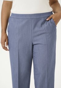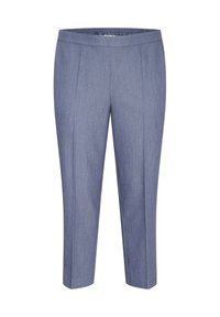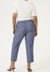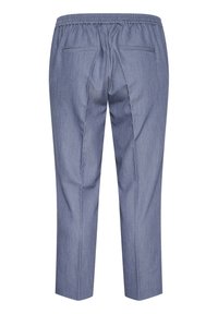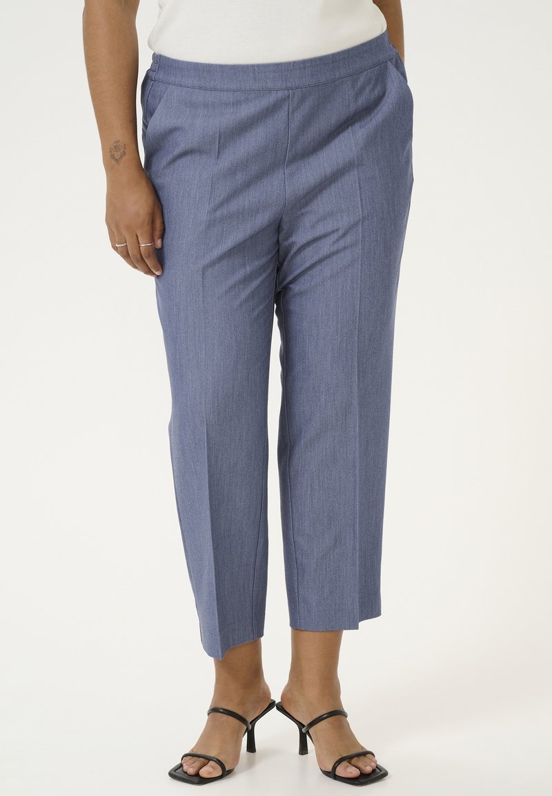 Femme portant un pantalon bleu raccourci à fines rayures et des sandales à talons noires à brides, debout les mains détendues le long du corps.