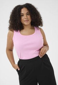 Femme aux cheveux bouclés portant un haut rose sans manches et un pantalon noir, posant avec une main dans la poche devant un fond uni.