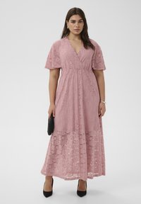 Femme portant une robe longue en dentelle rose poudré avec des manches papillonnantes, tenant une pochette noire et portant des talons noirs sur un fond uni.