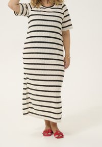 Robe rayée en maille crème et noire, valise argentée avec poignée télescopique, sandales plates noires, feuillage vert en arrière-plan.