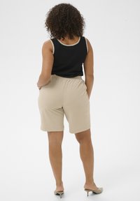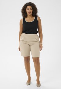 Femme portant un short beige sur mesure mi-long, un haut noir, des talons beiges à bout pointu, debout avec une main dans la poche sur fond blanc.