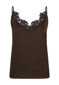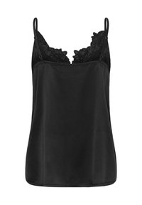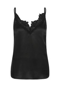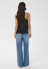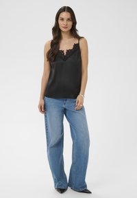 Femme souriante aux longs cheveux noirs portant un caraco noir orné de dentelle, un jean bleu, et une ceinture noire cloutée, les mains dans les poches.