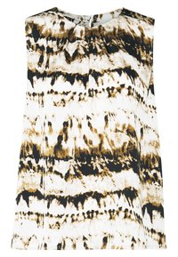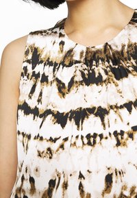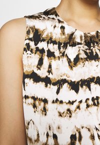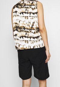 Haut sans manches avec motif abstrait noir, marron et blanc associé à un pantalon noir à cordon de serrage, mains dans les poches.