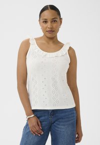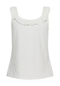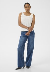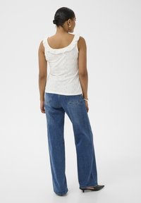 Femme portant un haut blanc sans manches avec des volants et des motifs ajourés, ainsi qu'un jean bleu, posant avec une main reposant près de sa hanche.