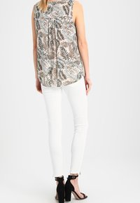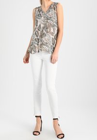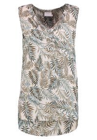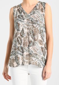 Blouse sans manches à col en V avec un fond beige et un motif de feuilles marron, noir et gris, portée avec un pantalon blanc sur une personne debout.