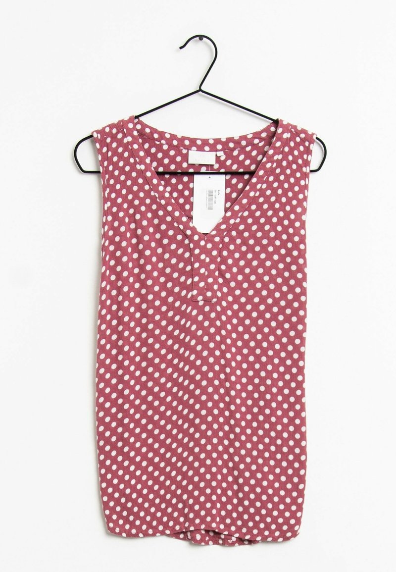 Blouse rose sans manches à pois blancs suspendue sur un cintre noir, sur fond blanc, montrant le devant et l'encolure.