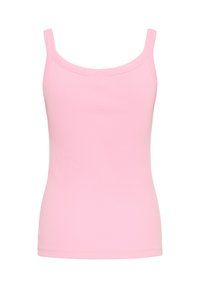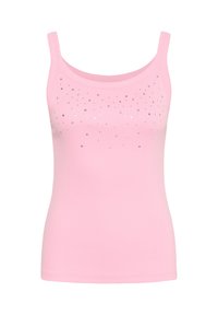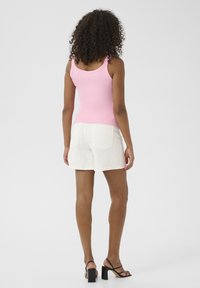Jeune femme aux cheveux bouclés, portant un haut rose sans manches à clous et un short blanc, debout les bras croisés, souriante devant un fond uni.