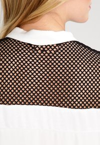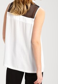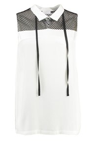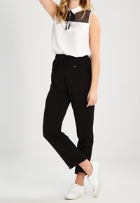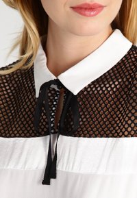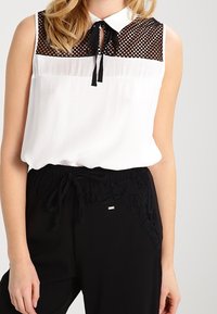 Blouse blanche sans manches avec empiècement en résille noire, petit noeud papillon au col, portée avec un pantalon noir orné de détails en dentelle et doté d'une taille à cordon de serrage.