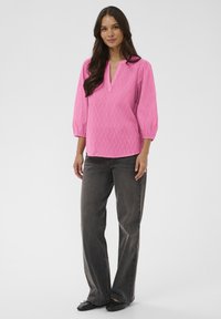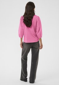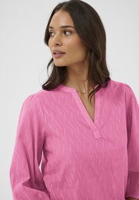 Femme avec de longs cheveux noirs portant un haut en satin rose vif texturé et un délicat collier en argent, regardant vers sa gauche devant un fond uni.