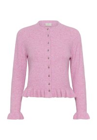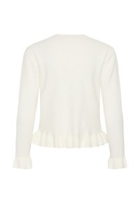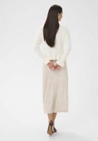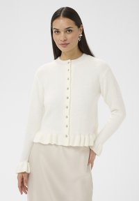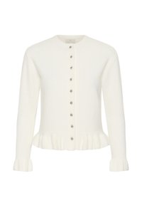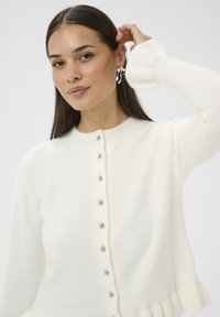 Femme aux longs cheveux foncés portant un cardigan blanc boutonné avec ourlet et poignets à volants, associé à une jupe beige clair, sur un fond uni.