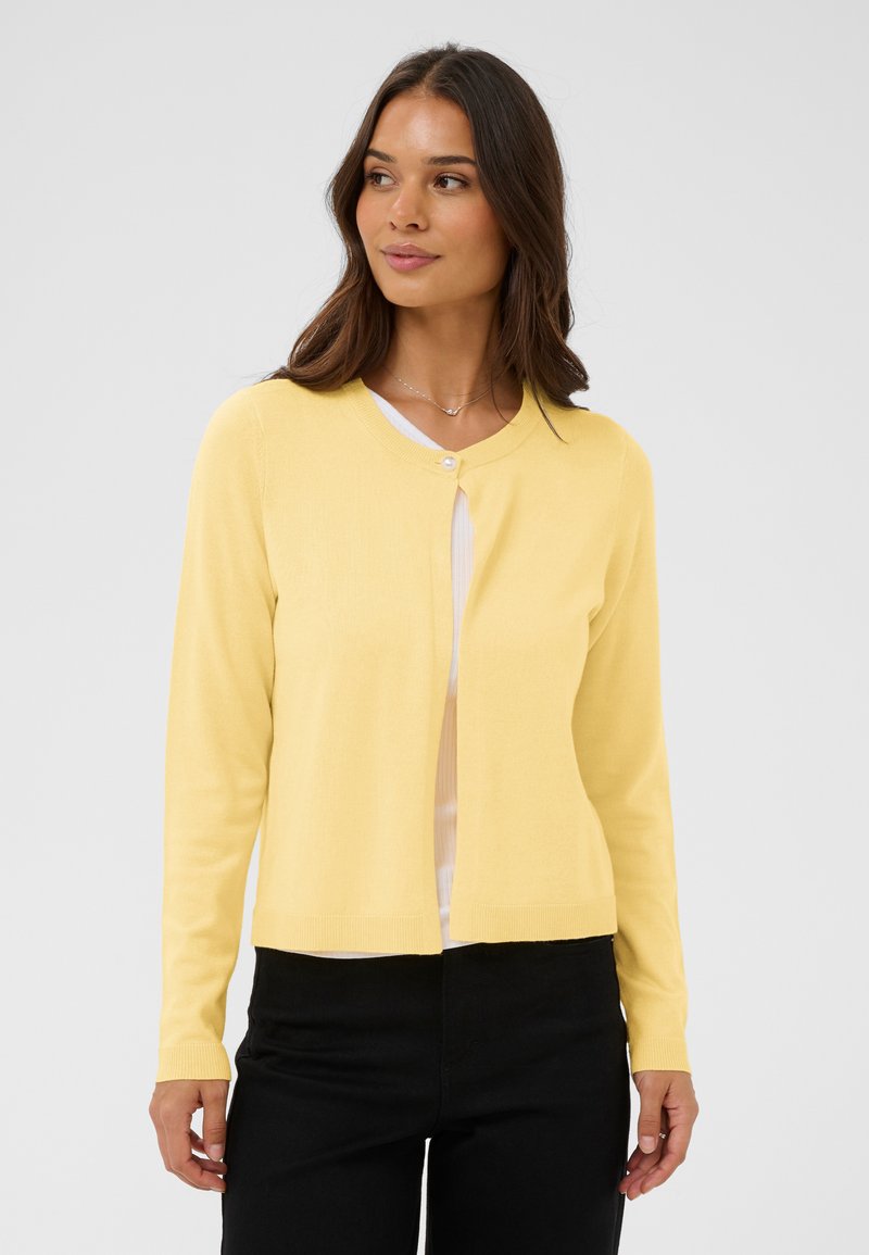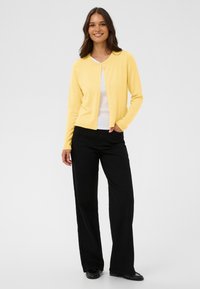 Cardigan jaune en tissu doux, avec un col rond, une fermeture à un bouton et des poignets côtelés, assorti à un haut blanc et un pantalon noir.