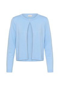 Cardigan bleu clair en tissu doux et texturé, doté d'un col rond et de six boutons sur le devant. Poignets subtilement côtelés.