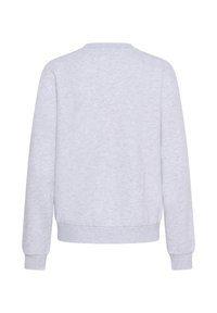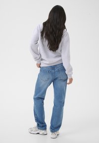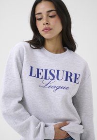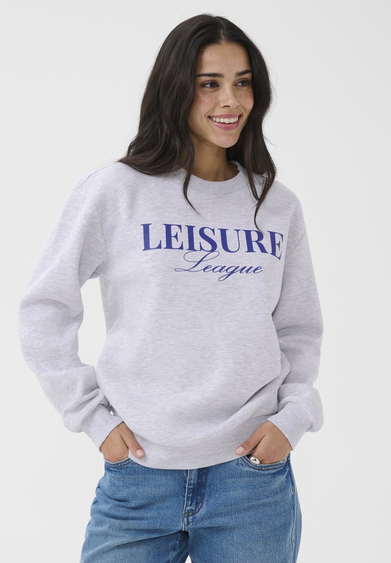 Femme souriante aux longs cheveux bruns portant un sweat-shirt gris clair avec le texte "Leisure League" et un jean bleu, les mains dans les poches.