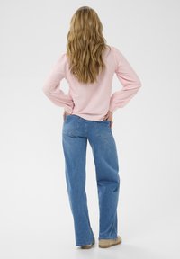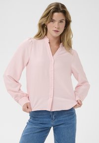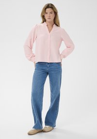 Chemise rose clair à boutons avec un tissu texturé, des manches longues bouffantes et un col à volants. Associée à un jean en denim bleu.