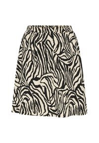 Jupe noire et blanche à imprimé zèbre avec une ceinture élastique, arrivant au-dessus du genou, associée à des sandales noires à enfiler et un haut noir ample.
