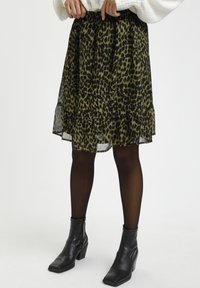 Personne portant une jupe à imprimé léopard vert et noir, des collants noirs translucides, des bottines à talons noires et un pull blanc, tirant sur la taille de la jupe.