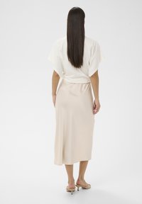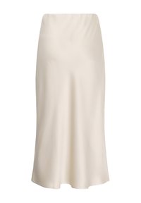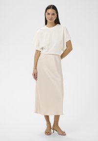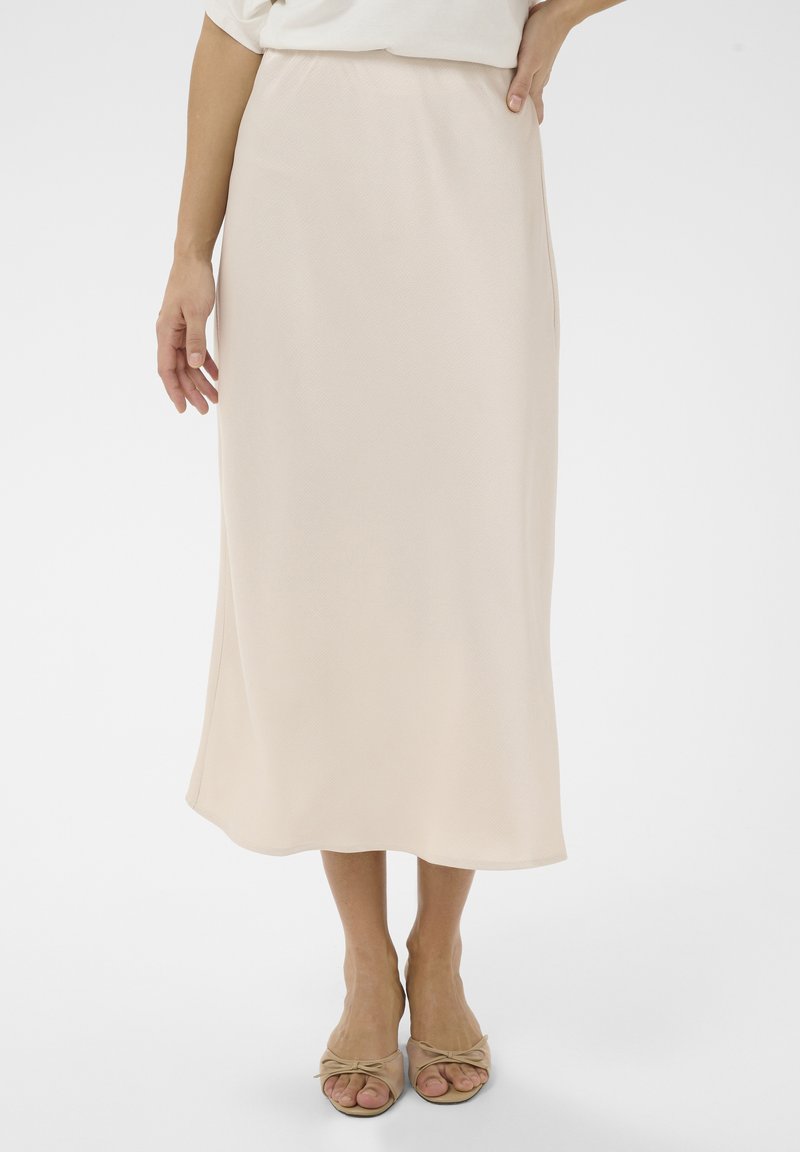 Femme portant une jupe midi taille haute beige clair et des talons ouverts beiges, debout devant un fond blanc.