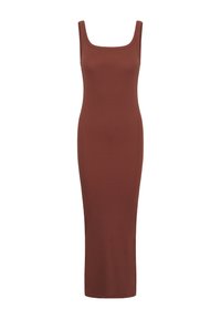 Robe midi noire sans manches avec fentes latérales. Fabriquée en tissu doux, avec une silhouette ajustée et un col rond.