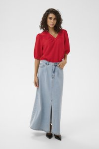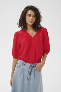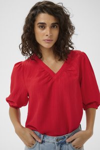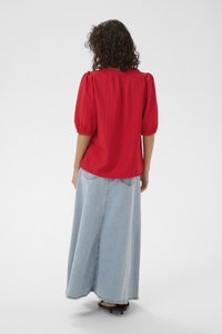 Femme aux cheveux bruns bouclés portant un chemisier rouge à col en V avec des manches bouffantes et un jean bleu clair, debout les mains dans les poches.