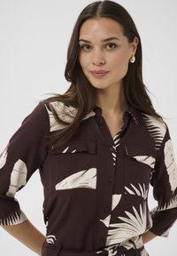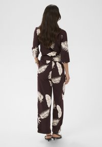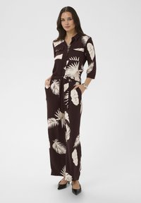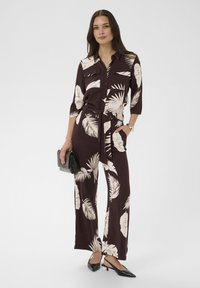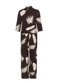 Femme portant une combinaison sombre avec de grandes feuilles tropicales blanches imprimées, debout les mains dans les poches, assortie à des talons noirs et un bracelet.