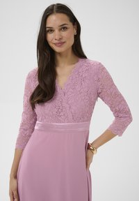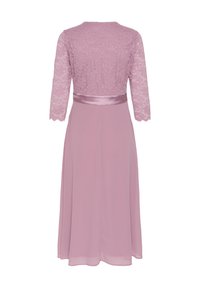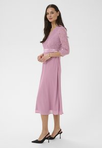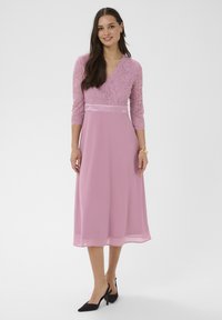 Femme portant une robe en dentelle rose mi-longue à manches trois-quarts et des chaussures à talons hauts noires, debout et souriante devant un fond uni.
