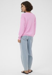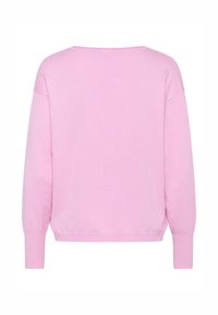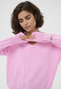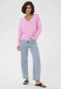 Femme souriante aux cheveux bruns courts, portant un pull rose à col en V et un jean bleu clair, debout devant un fond uni.
