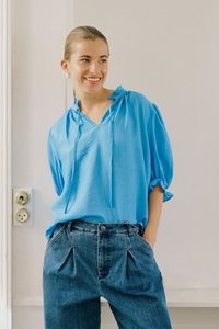 Jeune femme portant une blouse bleue ample avec un détail à nouer au niveau du col et des manches bouffantes, associée à un pantalon en denim à taille haute et plis.