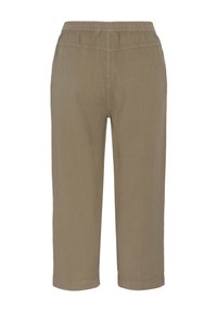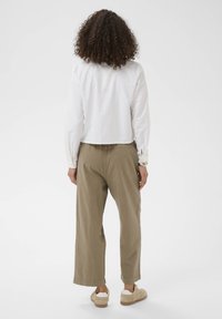 Personne portant un pantalon ample vert olive avec taille élastique et des baskets beiges, debout devant un fond blanc uni.