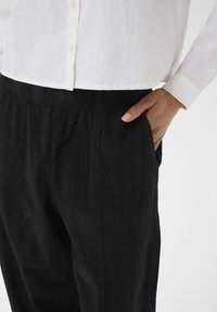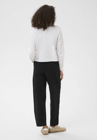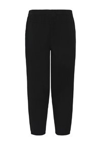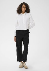 Personne portant un pantalon noir ample avec poches, des baskets beiges et un haut blanc à manches longues, debout devant un fond blanc.
