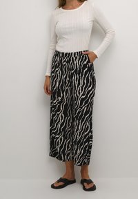Pantalons larges à rayures zébrées noir et blanc avec une taille élastique et des poches latérales, fabriqués en tissu léger. Stylisés avec des sandales noires.