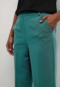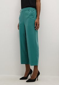 T-shirt noir à col en V associé à un pantalon court bleu sarcelle, présentant une texture lisse et des poches latérales. Porté avec des talons noirs à bouts pointus.
