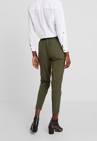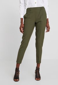 Femme portant un pantalon fuselé olive vert longueur cheville avec des ourlets retroussés, associé à des sandales à talons hauts noires à lanières et une chemise blanche boutonnée.