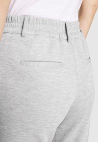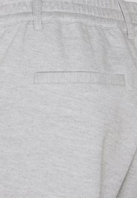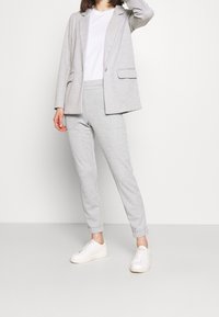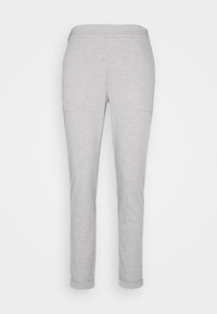Pantalons de survêtement gris avec une jambe fuselée, dotés de deux poches avant et d'une ceinture élastique confortable, associés à des baskets blanches.