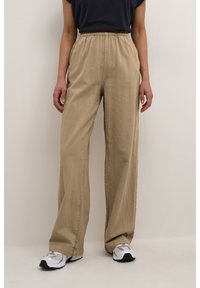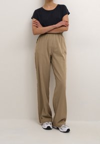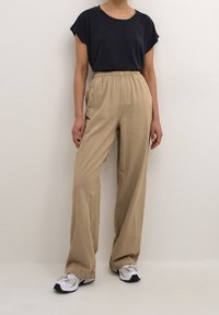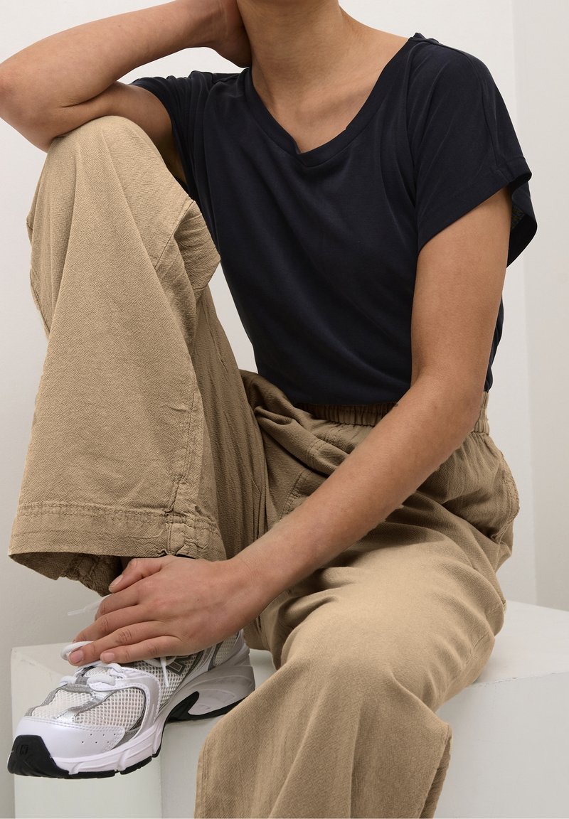 T-shirt à manches courtes bleu marine associé à un pantalon large beige et des chaussures de sport blanches. Caractéristiques : coupe décontractée et tissu texturé.