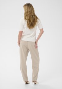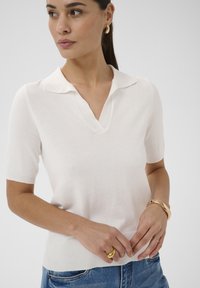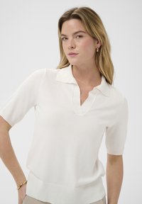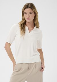 Femme aux longs cheveux blonds portant un polo blanc à manches courtes et un pantalon beige, debout avec une main dans la poche devant un fond blanc.