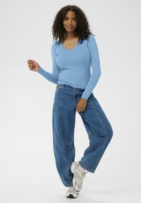 Femme aux cheveux bouclés portant un pull à col en V côtelé bleu clair et un jean bicolore bleu sur un fond blanc uni.