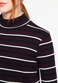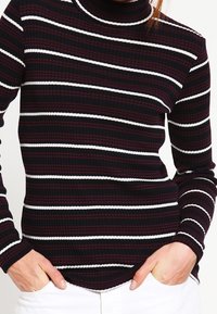 Personne portant un pull à col roulé côtelé à manches longues, rayé horizontalement en noir, blanc et bordeaux, les mains dans les poches d'un pantalon blanc.