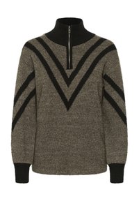 Pull à col zippé marron et noir avec motif chevron, maille texturée, col et poignets côtelés, coupe légèrement ample.