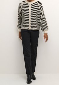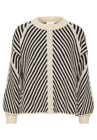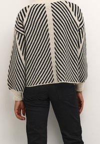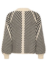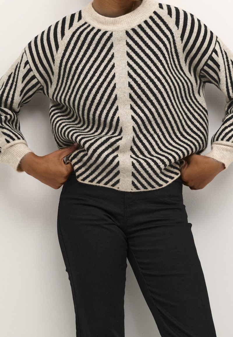 Pull crème avec des rayures noires diagonales, col et poignets côtelés, coupe décontractée, associé à un pantalon noir. Matière tricotée texturée.