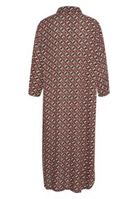 Robe chemise à manches longues avec ceinture à la taille, à motifs verts et noirs, en tissu léger, dotée de poches latérales et d'une silhouette fluide.