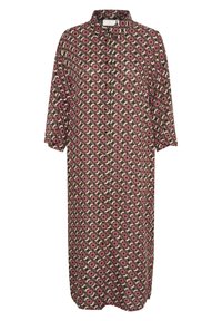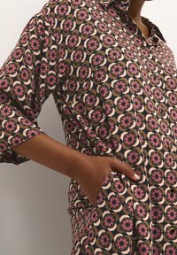 Robe boutonnée vert foncé avec un motif floral, manches trois-quarts et longueur au genou avec une fente à l'avant. Associée à des bottines beiges.