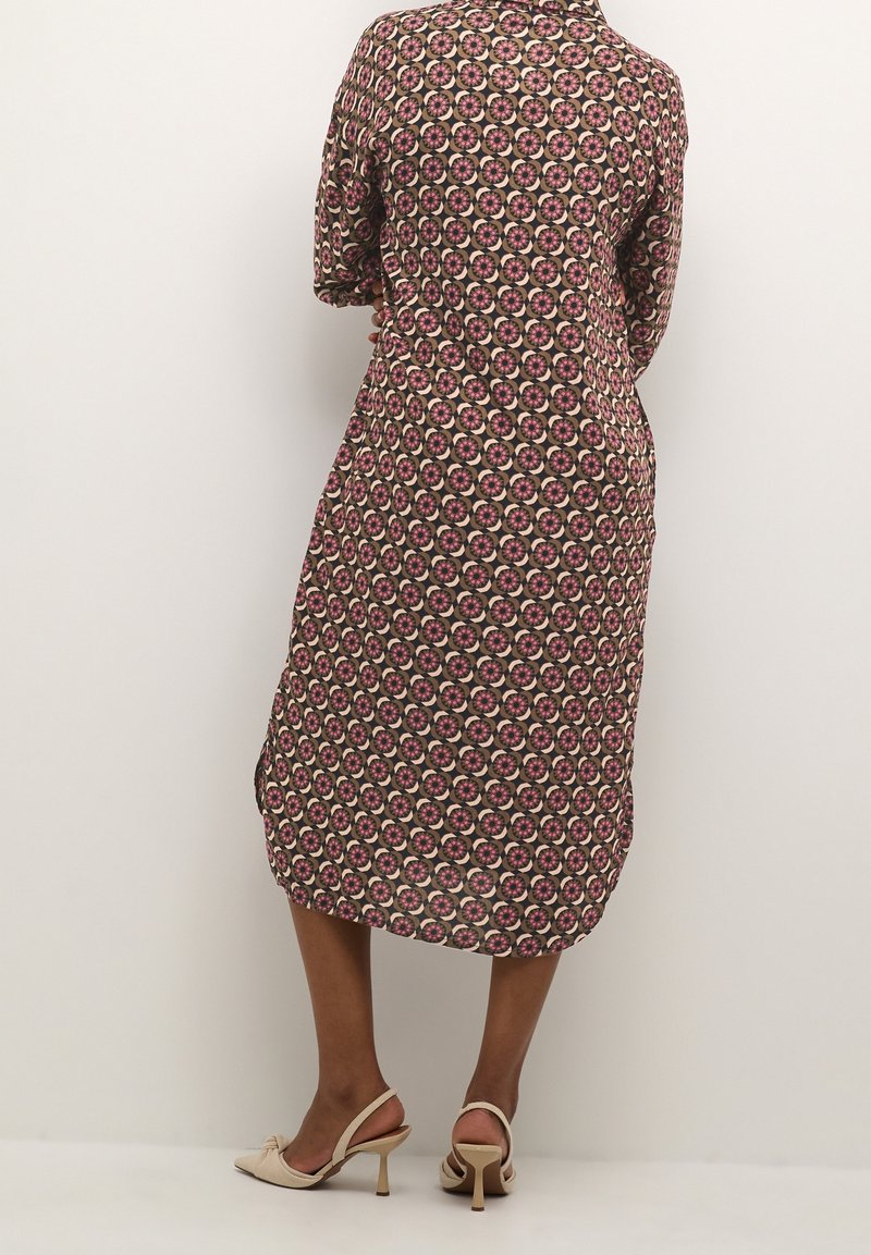 Femme portant une robe midi noire avec des taches abstraites beiges et blanches, à manches longues, boutonnée à l'avant et ceinturée à la taille, associée à des mocassins noirs.