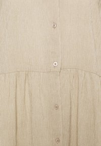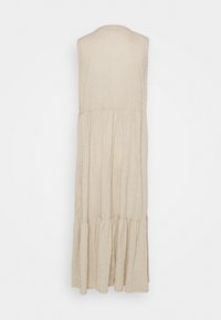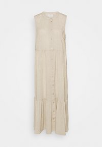 Robe midi beige sans manches avec un col rond, des boutons sur le devant et un ourlet à volants en étages. Confectionnée dans un tissu texturé avec un motif tissé subtil.