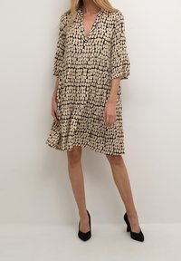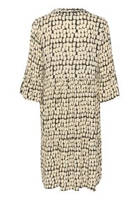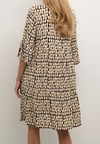 Robe légère à motifs noir et crème, avec un décolleté en v, un design à volants et des manches cloche trois-quarts avec une coupe décontractée.