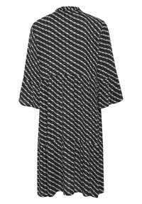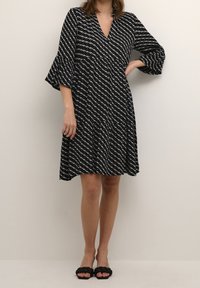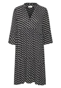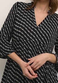 Robe noire mi-longue avec un motif géométrique blanc, dotée d'un col en V et de manches évasées trois-quarts, confectionnée en tissu léger.