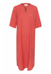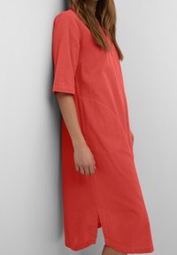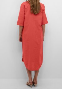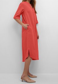 Femme portant une robe midi corail avec des manches aux coudes et un décolleté en V, associée à des escarpins slingback à talons bas couleur nude.